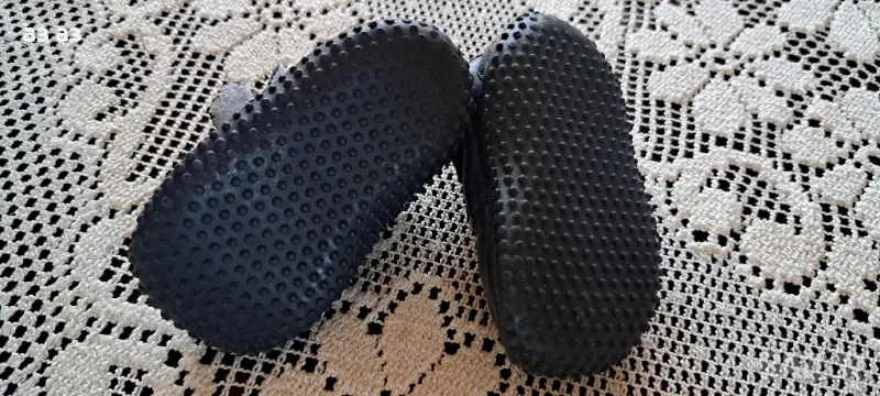 Обувчиците са от естествена кожа и естествен хастар.Много лесни за обуване на бебето.Без забележки, в отлично състояние. Подходящи за момченце- тъмно сини.От прането,надписа на стелката,където е номера се изтърка, но са подходящи за бебе между 4-7 месеца...в количката и да са малко по-големи не е проблем,защото може да се стегнат с велкрото и не падат.. а зависи и от дебелината на чорапчето...Стелката измерена от мен е 10,5 см