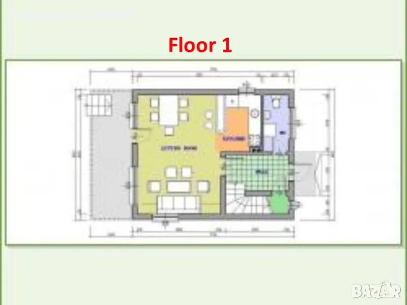 - първи етаж – всекидневна, кухня, баня и