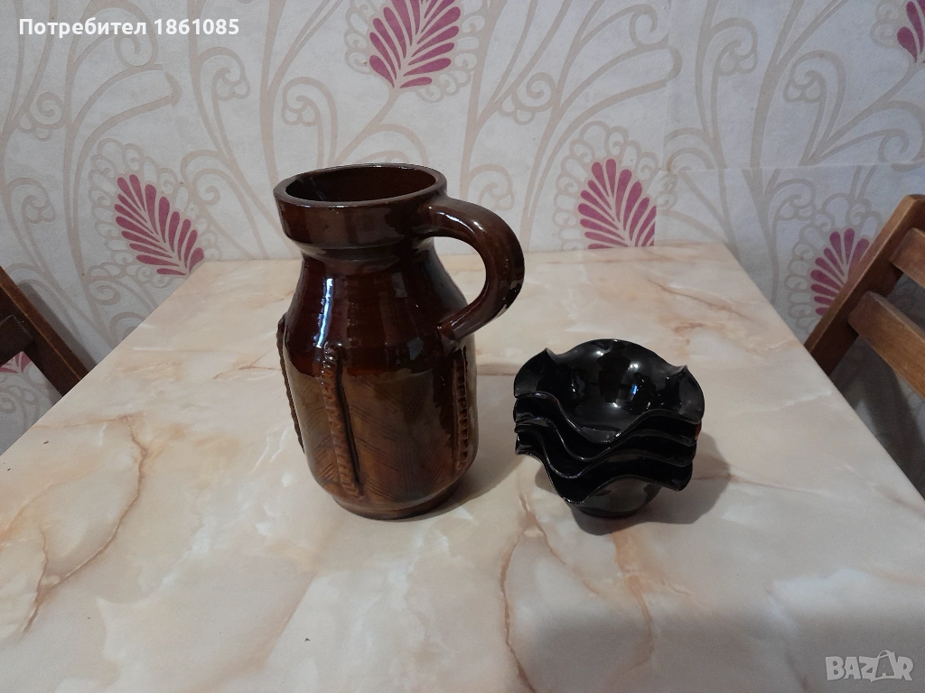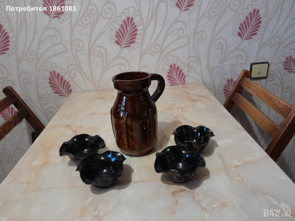 Традиционна българска керамична кана на изгодна цена.Вместимост е около 1 литър. Купичките са подходящи за ядки, сладко или за уют във вашия дом.Цената за всичко е 4 евро, изгодно е .