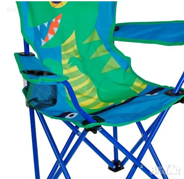 Сгъваем стол за къмпинг за деца, със здрава рамка с 0,7 мм пръти, 56 см отвор за ръката и издръжлива оксфордска тъкан 600 D с PE покритие. Има поставка за чаша на дясната дръжка и дизайн на динозавър. Сгъва се за лесно съхранение и има чанта за носене.