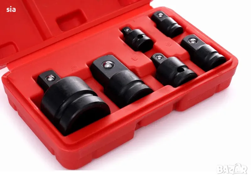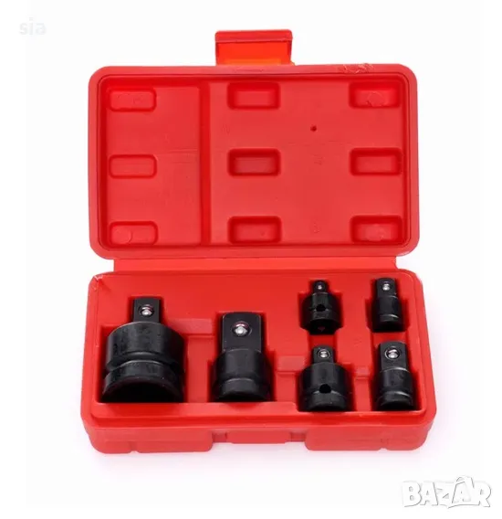 Марка Kraft&Dele с обозначение KD10524.Комплект специализирани редуктори и адаптери, предназначени за работа с ударен гайковерт. Редуциите се характеризират с издръжливост и надеждност. Елементите са изработени от инструментална стомана CR-MO, което гарантира тяхната издръжливост и дълъг експлоатационен живот. Перфектни са за работа под натоварване, както в домашна работилница, така и в професионален обект. Освен това имат заключваща топка.