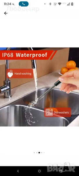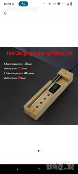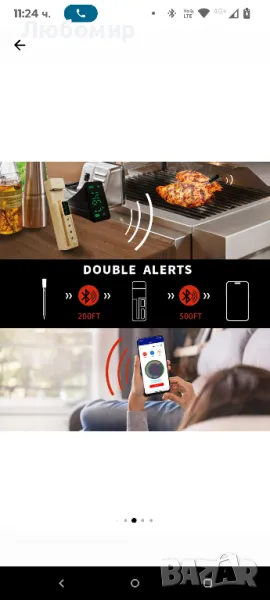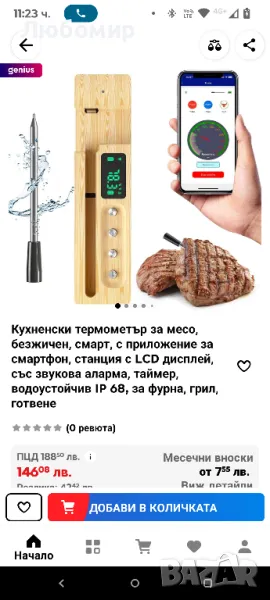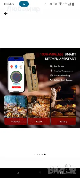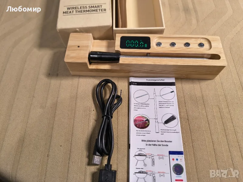 Кухненски термометър за месо, безжичен, смарт, с приложение за смартфон, станция с LCD дисплей, със звукова аларма, таймер, водоустойчив IP 68, за фурна, грил, готвене
