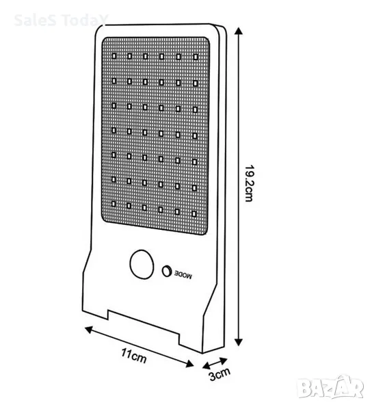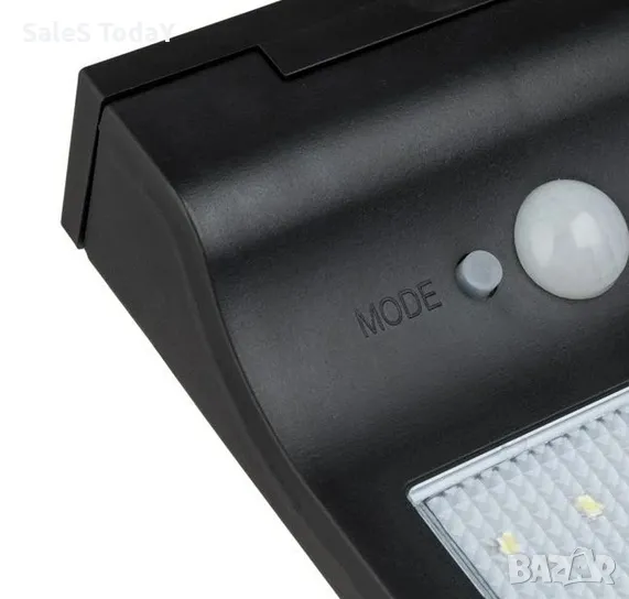 Соларен фенер, черен, с 35 светодиода с бяла светлина, има акумулаторна батерия и яркост 300 лумена. Има бутон за включване/изключване и може да се монтира на стена.