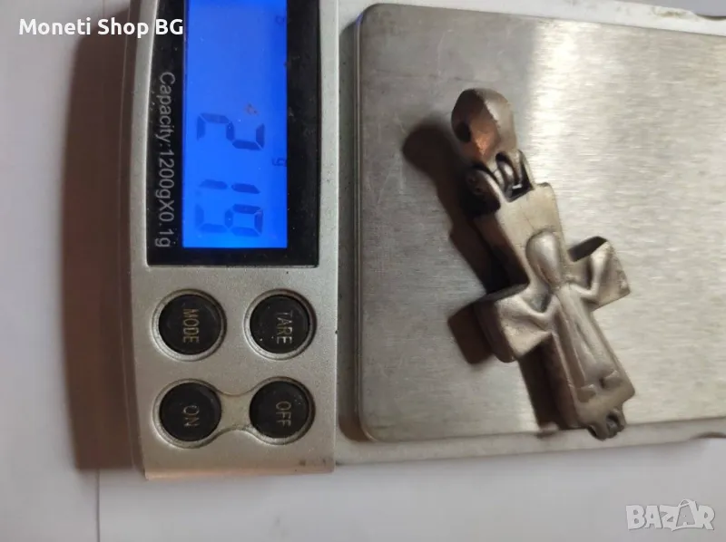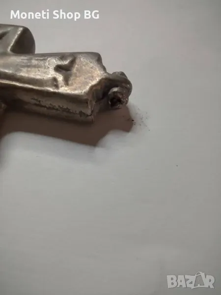 Кръстът е направин от оловно калаена бисмутна смес и е посребрен.