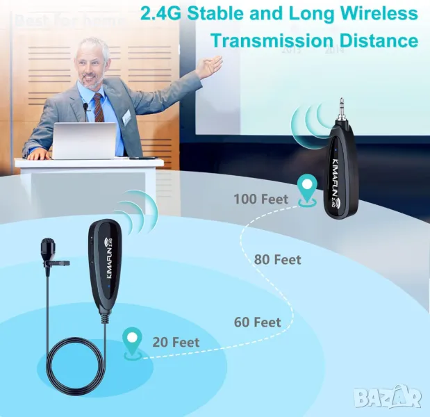 Стабилен сигнал: тези безжични микрофони използват международна технология за безжично предаване на 2,4 GHz, което опростява настройката. Просто включете предавателя и приемника едновременно, те автоматично ще съвпаднат. Без статични смущения, без повреда при използване на разстояние от 50-100 фута. Ниският шум го прави идеален вокален микрофон, както и перфектен за глас и аудио запис.