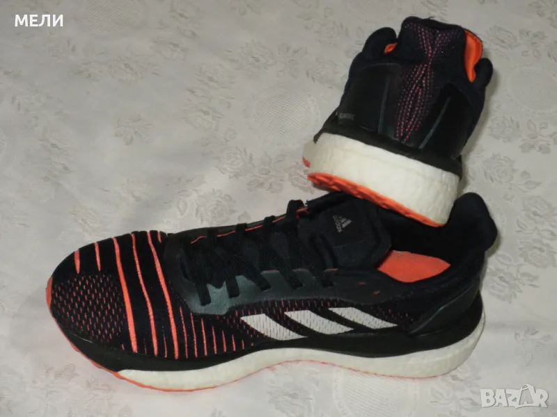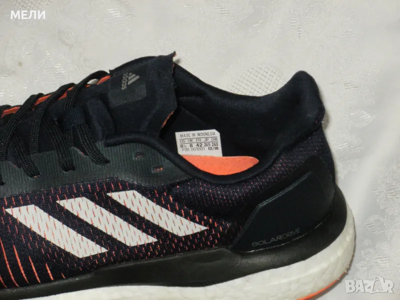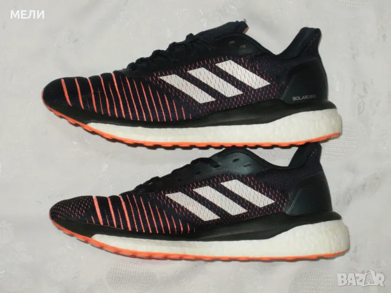 Маратонките са на ADIDAS, обувани, без забележки. Лятно проветриво модвлче. По номер са 42 и си отговарят. Направени са с проветрива горна част от мрежа , която прилепва добре и защитава краката. Подметката Solar Propulsion Rail помага за лесното повдигане на краката при бягане. При всяко вдигане на краката се възвръща енергията в подметката отнета при стъпването. Олекотен модел. Цветовете са като на снимките, основно тъмно син и коралов.