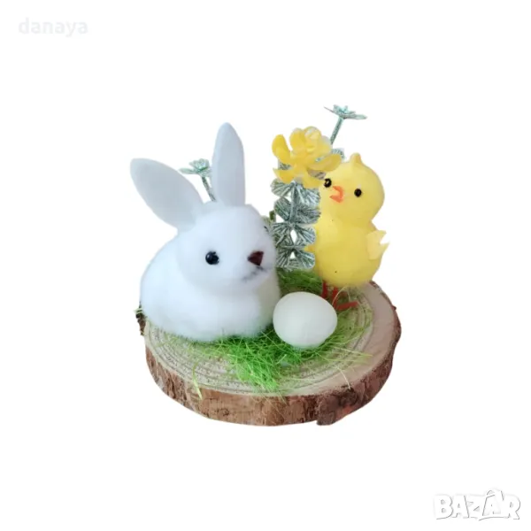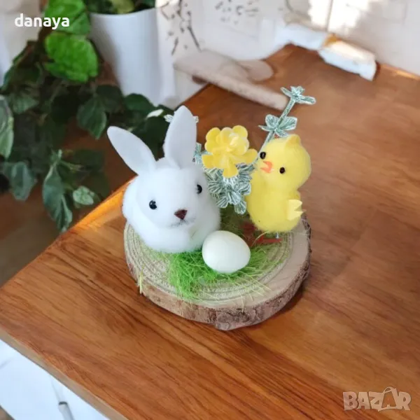 Създайте уютна и весела атмосфера с тази ръчно изработена Великденска декорация! Композицията включва пухкаво бяло зайче, жълто пиленце, декоративно яйце и пролетни цветя, разположени върху дървена основа с диаметър 8 см.