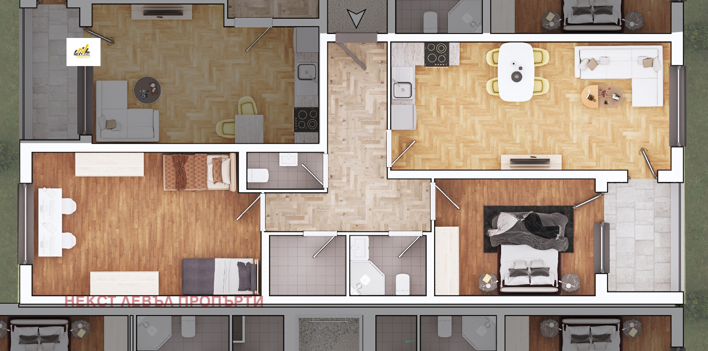 Агенция Некст Левъл Пропърти предлага на Вашето внимание тристаен апартамент от доказан строител в затворен комплекс със следното разпределение: коридор, кухненски бокс с трапезария,две спални, баня с тоалетна,тоалетна, склад/мокро помещение и тераса.