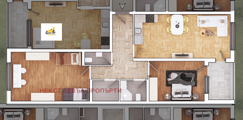 Агенция Некст Левъл Пропърти предлага на Вашето внимание тристаен апартамент от доказан строител в затворен комплекс със следното разпределение: коридор, кухненски бокс с трапезария, две спални, баня с тоалетна, тоалетна, склад/мокро помещение и тераса.