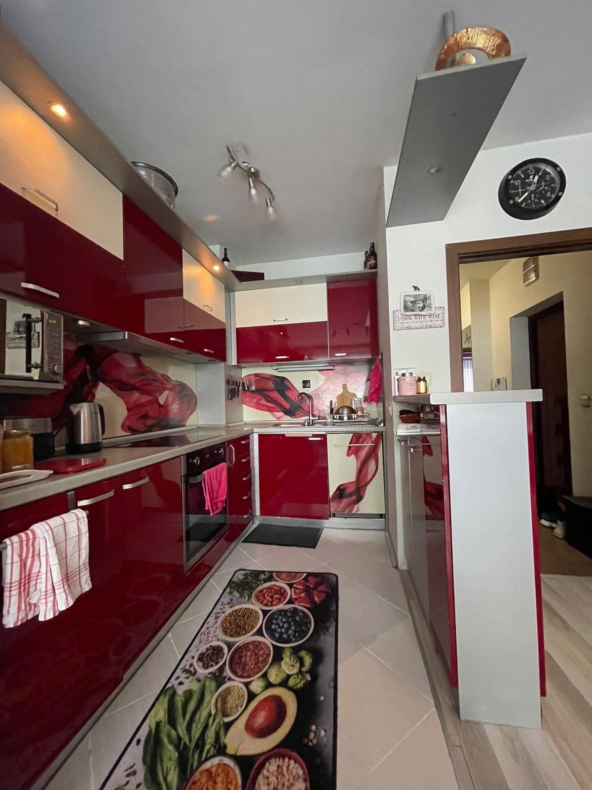 Имотът е разположен на 2ри жилищен етаж и разполага с площ от 105 кв.м, разгърнати в следното практично разпределение:коридор, просторна и функционална всекидневна с модерна кухня, напълно оборудвана с всички необходими електроуреди, две спални, , две бани с WC и две тераси идеални за вашите сутрешни кафета или вечерни релаксации.