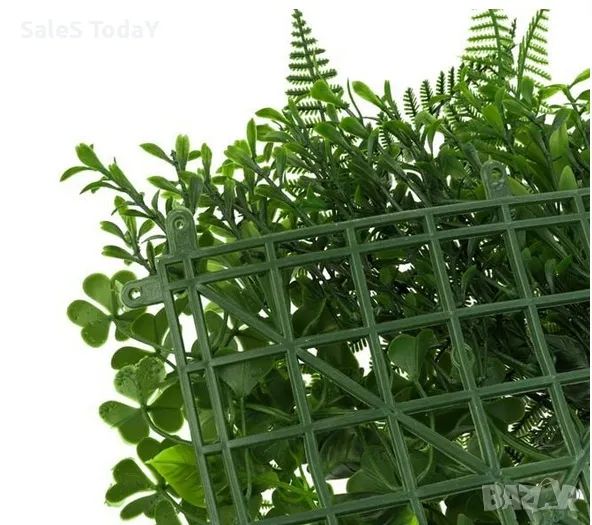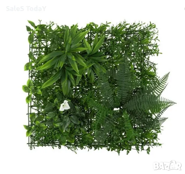Плочка със зеленина, растения и бели цветя. Има свързващи щифтове и капси отстрани, така че можете да съедините части за монтаж. Устойчив е на UV лъчи.