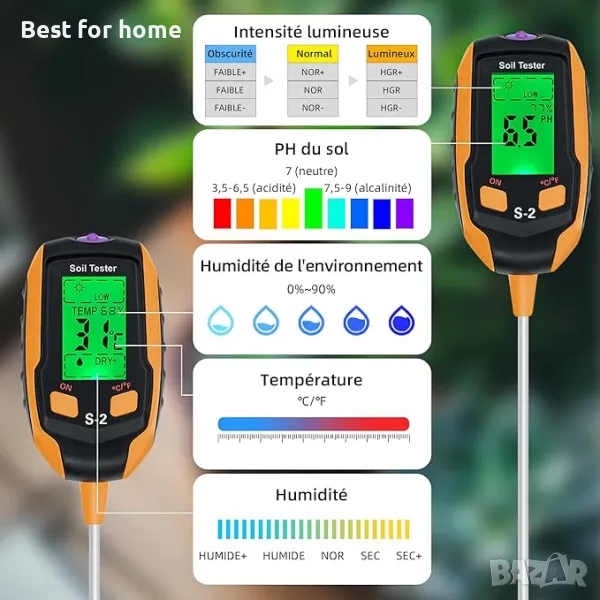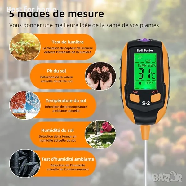 【Уред за измерване на влага в почвата 5 в 1】 Уред за измерване на влага в почвата 5 в 1 е универсален инструмент за градинарство, селско стопанство и грижа за растенията на открито. Комбинира пет функции в едно устройство: измерване на влажността на почвата, температурата, влажността на околната среда, нивото на pH и интензитета на слънчевата светлина. Прави го идеалният спътник за вашите цветя и растения.