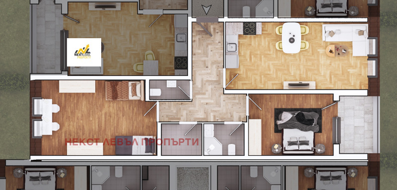 Агенция Некст Левъл Пропърти предлага на Вашето внимание тристаен апартамент от доказан строител в затворен комплекс със следното разпределение: коридор, кухненски бокс с трапезария, две спални, баня с тоалетна, тоалетна, склад/мокро помещение и тераса.