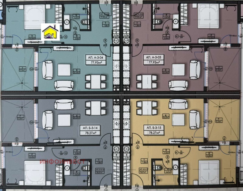 Едностайни, двустайни, тристайни апартаменти с удобно и модерно разпределение. Разположени на трети и четвърти жилищен етаж.