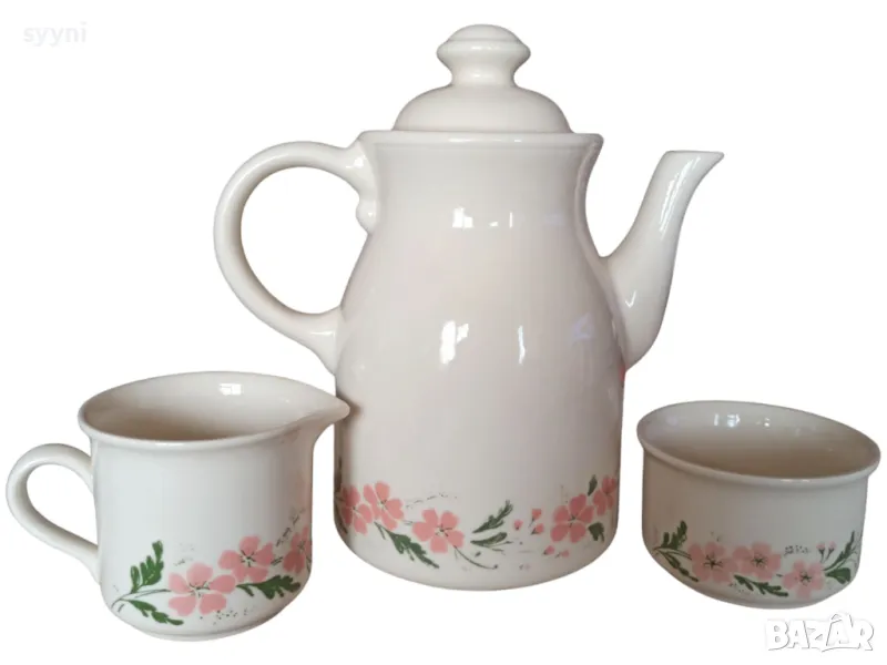 🌸Всяка част е завършена с гланцово, огледално покритие. ▶️Единствената забележка е лека пукнатина и започнало образуване на кракле, на каничката. Всички останали части са без забележки.