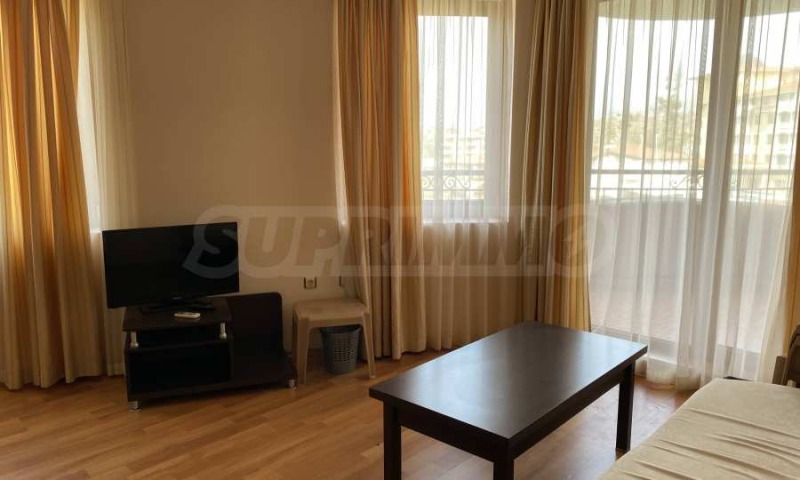 тераса с гледка към басейна и морето. Апартаментът е изключително подходящ за покупка с цел инвестиция - отдаване под наем. В ресторанта срещу заплащане се предлага изхранване тип ол-инклузив.