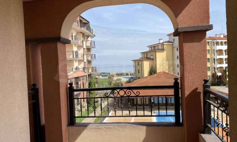 тераса с гледка към басейна и морето. Апартаментът е изключително подходящ за покупка с цел инвестиция - отдаване под наем. В ресторанта срещу заплащане се предлага изхранване тип ол-инклузив.