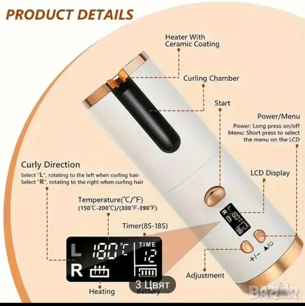 Безжичен акумулаторен уред за къдрене на коса, снимка 1 - Друга електроника - 49665918 Безжичен акумулаторен уред за къдрене на коса, снимка 2 - Друга електроника - 49665918 Безжичен акумулаторен уред за къдрене на коса, снимка 3 - Друга електроника - 49665918 Безжичен акумулаторен уред за къдрене на коса, снимка 4 - Друга електроника - 49665918 1/4