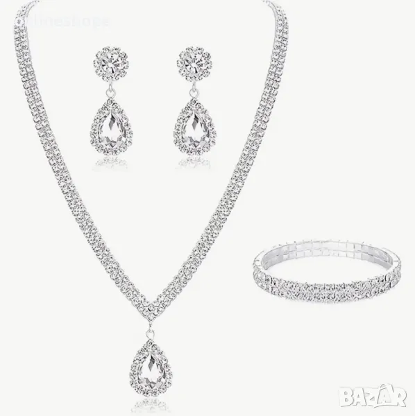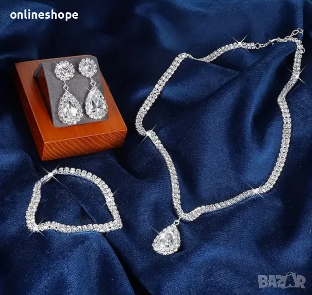 Изискан комплект от 4 части, включващ елегантно колие, нежен чифт обеци и блестяща гривна. Всеки елемент е инкрустиран с висококачествени кристали, които улавят светлината и придават изключителен блясък.