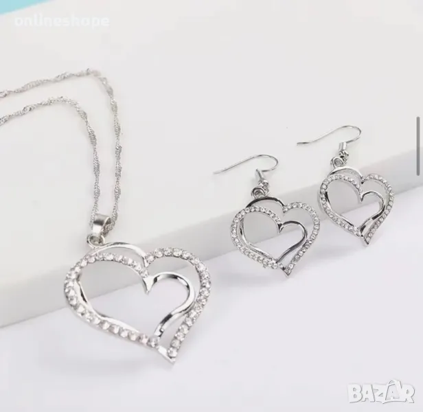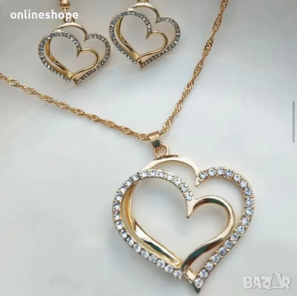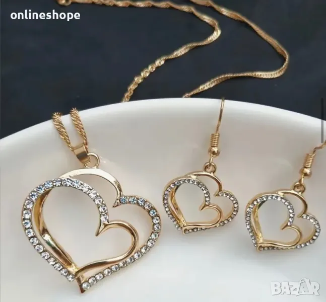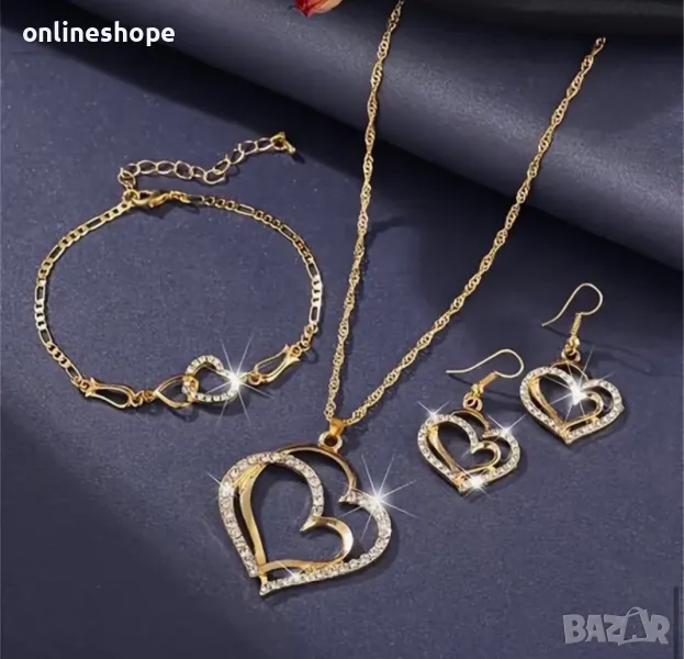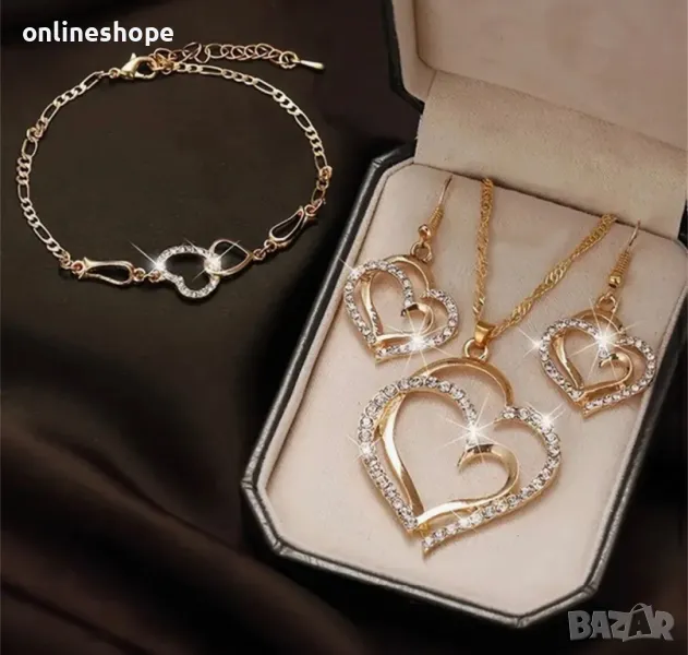 Романтичен и елегантен комплект от 3 части – колие, обеци и гривна, с форма на двойно сърце, инкрустирани с нежни камъчета. Изработен с 14K златно покритие, този комплект е идеален за специални моменти, подарък за любим човек или за да подчертаеш собствената си женственост.