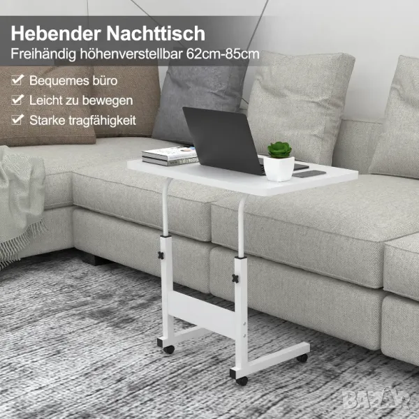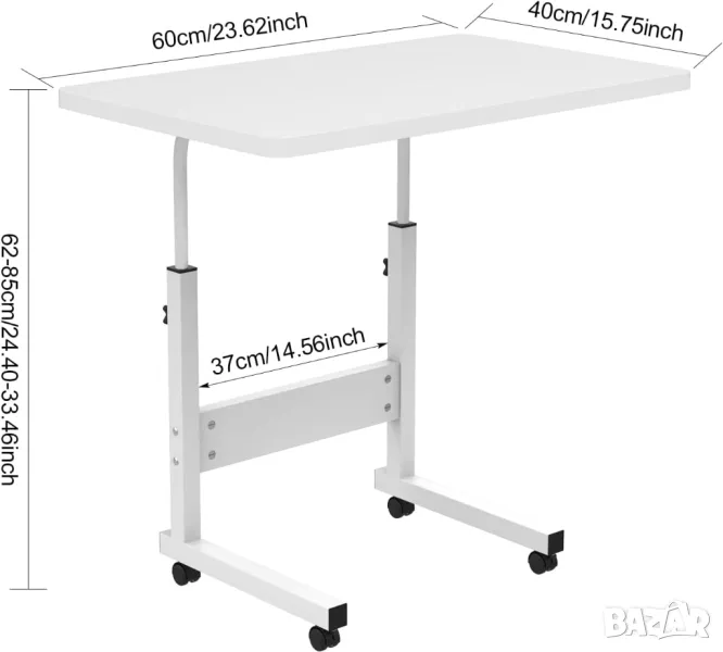 - Стояща маса с регулируема височина: регулируема по височина маса за лаптоп бюро може да се регулира на различни височини (62-85 см). Бюрото за лаптоп може да ви помогне да намерите здравословен баланс между седнало и изправено положение по време на работа. Регулирайте бутоните под леглото на страничната маса, за да отговарят на различните изисквания за височина. Масата за лаптоп с колела може ефективно да облекчи болките в раменете, причинени от дълго седене, да подобри ефективността на работа и удобния офис.