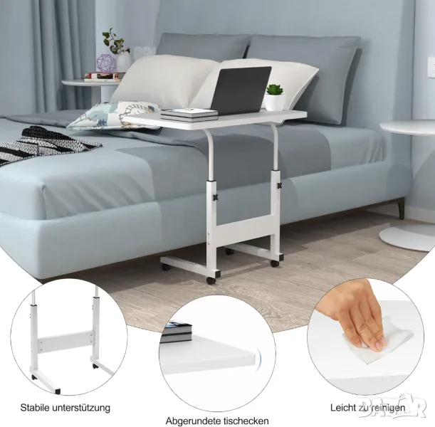 - Повдигащо се мобилно компютърно бюро: страничната масичка на масата за лаптоп е проектирана с дъгообразен ъгъл, за да предотврати сблъсъци и да осигури безопасно използване. Масата за легло на колела може да се използва не само като маса за лаптоп, но и като масичка за кафе, маса за хранене, маса за закуски, за учене или работа. Страничната маса има различни функции, които могат да подобрят щастието от живота.