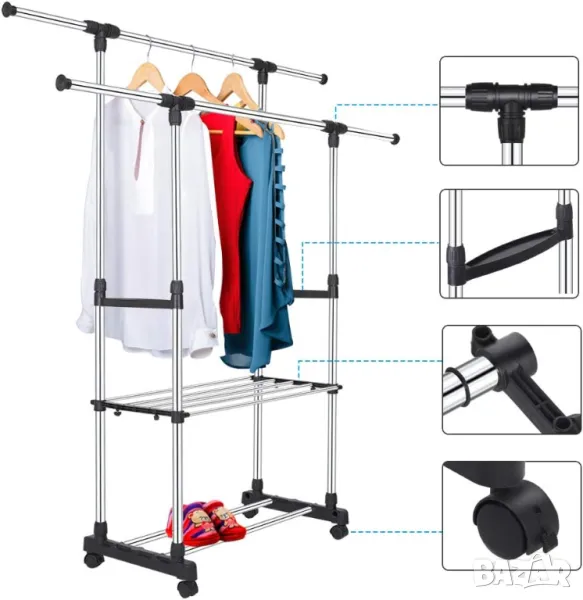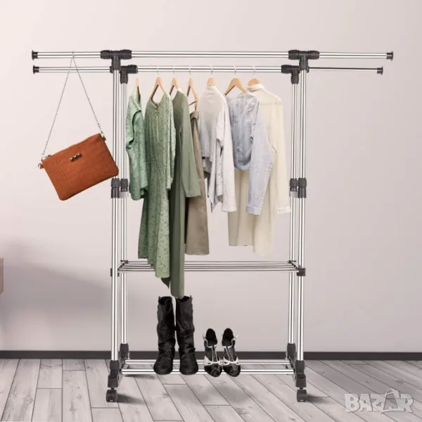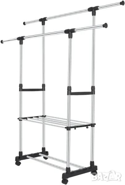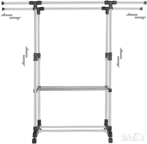 Пръчки за гардероб 2 релси за дрехи Поставка за дрехи на колела Разтегателна от 75 до 151 см Регулируема на височина прът за окачване на гардероб