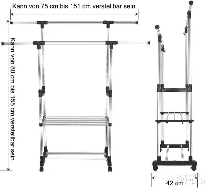 Разтегателен дизайн: Регулируемата стойка за дрехи може да се удължи в двата края, осигурявайки широка гама от ширини от 82 cm до 151 cm. Освен това височината може да се регулира от 80 см до 155 см, което ви позволява да персонализирате багажника, за да пасне на различни пространства и да побере повече дрехи