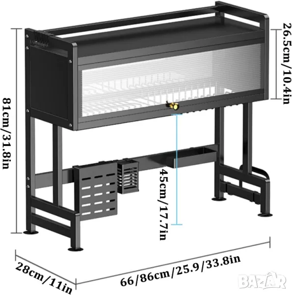 МНОГОПРЕДНАЗНАЧЕНОСТ И СПЕСТЯВАНЕ НА ПРОСТРАНСТВО В допълнение към кошницата, която може да се използва за различни цели, тази мивка тип стелаж е оборудвана и с други инструменти за съхранение, за да отговори ефективно на широкия ви набор от приложения. Може ефективно да ви помогне да съхранявате всички видове почистващи препарати, като купи, чинии, ножове, чаши за вино, дъски за рязане и др.