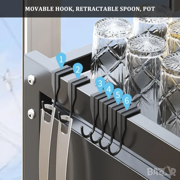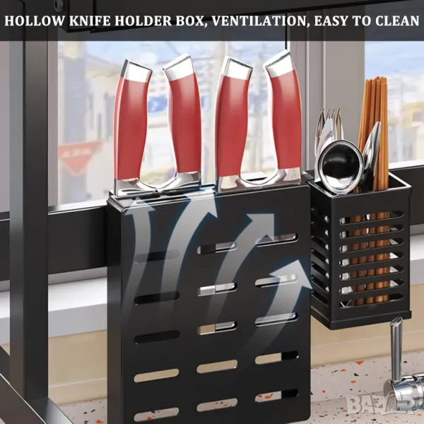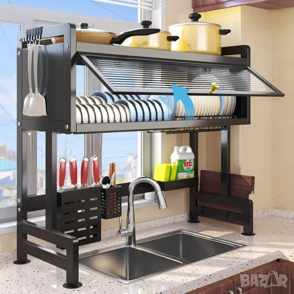 ДВУСЛОЙЕН ДИЗАЙН ЗА СЪХРАНЕНИЕ Поставката за прибори над мивката е достатъчно издръжлива. Големият капацитет може да побере всички прибори за хранене, без да заема място. Дизайнът над мивката позволява водата да се източва директно в мивката, а не в плота, като ефективно се избягва натрупването на вода.