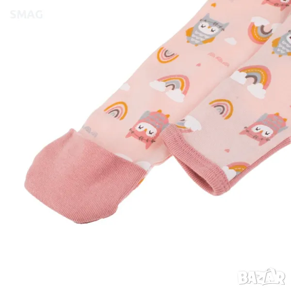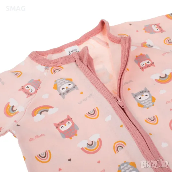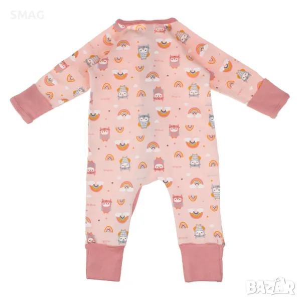 Розов памучен бебешки комбинезон ромпър с мотиви на бухали, дъга и сърца. Закопчава се отпред с цип, който стига до крака, а врата има предпазна капачка, за да не пречи на детето. Крачолите и ръкавите му имат капак, който можете да завъртите, за да ги затворите около ръцете и краката на детето.