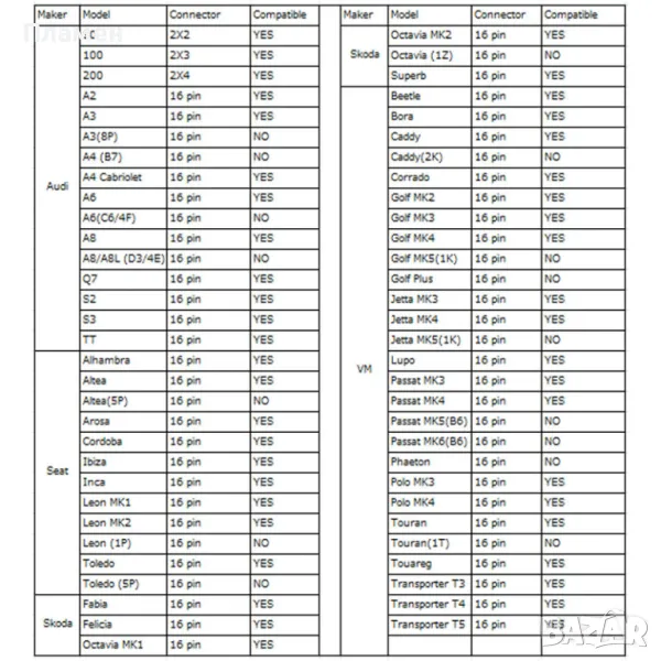 Работи със следните модели на Ауди, Шкода, Сеат и VW: