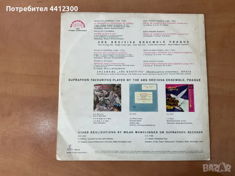 Здравейте, грамофонна плоча 12 инча- Francois Couperin, Jean-Philippe Rameau- ars rediviva ensemble.Не нося отговорност за състоянието на плочите, не почиствам плочи. Вие поемате риск, когато закупувате от мен, ако имате въпроси, може да ми звънете на посочения номер или да ми напишете съобщение. Отговарям след 18 часа, цените не се коментират, ако не се вземат повече от 10 плочи. Благодаря, че прегледахте обявата ми. Лек и спокоен ден!