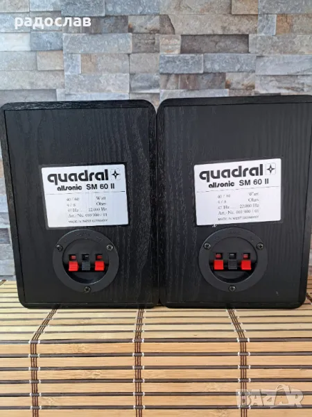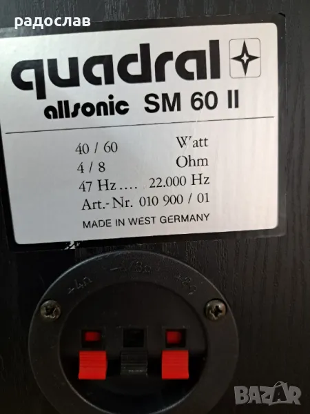 Двулентови немски тонколони Quadral Allsonic SM60. С много добър външен вид и отлично функциониращи. Габаритни размери: височина 24.3cm, ширина 17.3cm, дълбочина 15.3cm. Тонколоните са затворен обем с 5″ мидбасови говорители. Номинална мощност 40w, музикална мощност 60w, импеданс 4/8ohm, честотна лента 47Hz-22kHz. Произведени в Западна Германия.