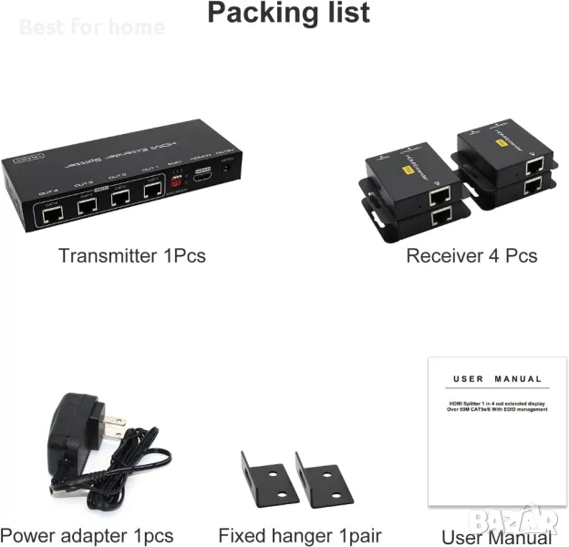 Разклонител за HDMI удължител през CAT6 Разклонителят за HDMI разширител може да раздели един HDMI сигнал на четири еднакви сигнала и да премине до 165 фута през CAT6 кабела, идеален като дистанционен аудио/видео разширител