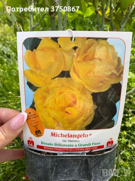 РОЗА 🌹 MICHELANGELO ® Meitelov 🌹🌹🌹🌹 Тази романтична роза има мимоза-жълт цвят и изглежда сякаш току-що е извадена от палитрата на Микеланджело. Венчето е двойно и изпълнено с около 50 венчелистчета, разположени в много изящна чашковидна форма. Всеки клон носи до пет големи цвята (12 см в диаметър), които излъчват приятен плодов аромат. Розата, подходяща за отглеждане на малки групи или самостоятелно в градината.🌹🌹🌹 Характеристики:Клас: Едроцветна храстова роза ROMANTICA®Употреба: Изолирани, стени и огради, букетиФорма: ROMANTICA®Цвят: ЖълтДиаметър: 12смБрой венчелистчета: приблизително 55Аромат: умерен, плодов розе, праскова, сливаЛиста: Гъста, релефно зеленаУстойчивост на болести: ОтличнаСъцветие: единичен цвятЦъфтеж: от пролетта до замръзванеВисочина: 60/100см🌹Награди:1997: Монца, Италия - Златен медал, Paris Bagatelle, Франция - Сертификат2000: Орлеан, Франция - Кристална роза2001: Хага, Холандия - Парфюмна награда и сертификат🌹 Meilland е водещият френски производител на рози, с около 1,2 милиона продадени рози годишно и повече от 500 референции. Сортовете Meilland са обект на патенти, сертификати за сортове растения и търговски марки, за да се гарантира популяризирането им в повече от 40 страни. Френското производство, обхваща близо 2500 декара при различни почвени и климатични условия, което позволява по-голяма сигурност на производството и по-добро адаптиране.🌹 Розите са засадени в работни саксии и могат да се засаждат на постоянно място от ранна пролет до късна есен.👉👉👉 Цена 34,00 лв.🚘📦🚘 Изпращаме с куриер.може да направите поръчка и на телефони:☎️💌☎️ Reni's Gardens +359888873211 +359886771048#рози #MICHELANGELO®Meitelov #Meilland #красивирози #ароматнирози