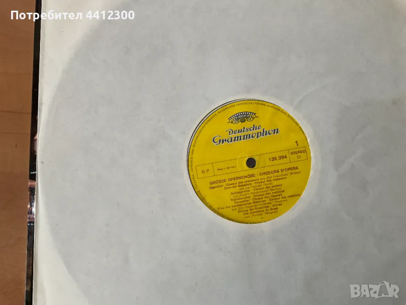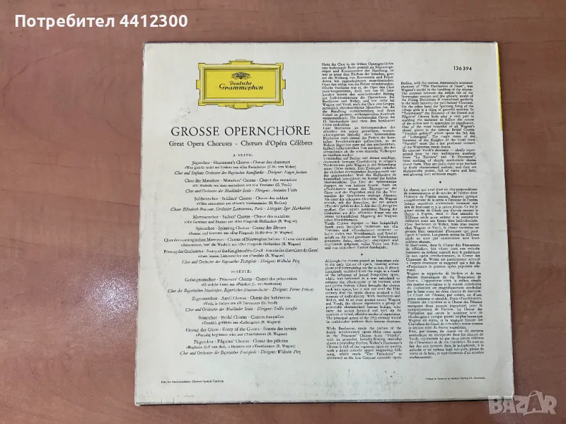 Здравейте, грамофонна плоча 12 инча- Grosse opernchore. Не нося отговорност за състоянието на плочите, не почиствам плочи. Вие поемате риск, когато закупувате от мен, ако имате въпроси, може да ми звънете на посочения номер или да ми напишете съобщение. Отговарям след 18 часа, цените не се коментират, ако не се вземат повече от 10 плочи. Благодаря, че прегледахте обявата ми. Лек и спокоен ден!