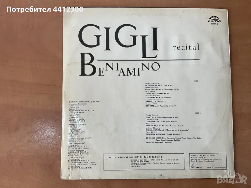 Здравейте, грамофонна плоча 12 инча- Gigli Beniamino. Не нося отговорност за състоянието на плочите, не почиствам плочи. Вие поемате риск, когато закупувате от мен, ако имате въпроси, може да ми звънете на посочения номер или да ми напишете съобщение. Отговарям след 18 часа, цените не се коментират, ако не се вземат повече от 10 плочи. Благодаря, че прегледахте обявата ми. Лек и спокоен ден!