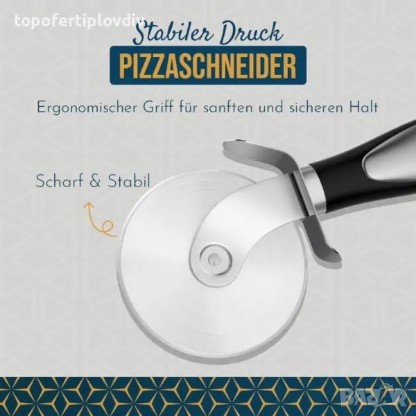 ОСТРО РЯЗАНЕ Този нож за пица, изработен от висококачествена неръждаема стомана, е идеален за тънки или дебели пици. Колелото с диаметър 7 cm е идеално за нежно рязане, така че не се налага да режете напред и назад отново и отново