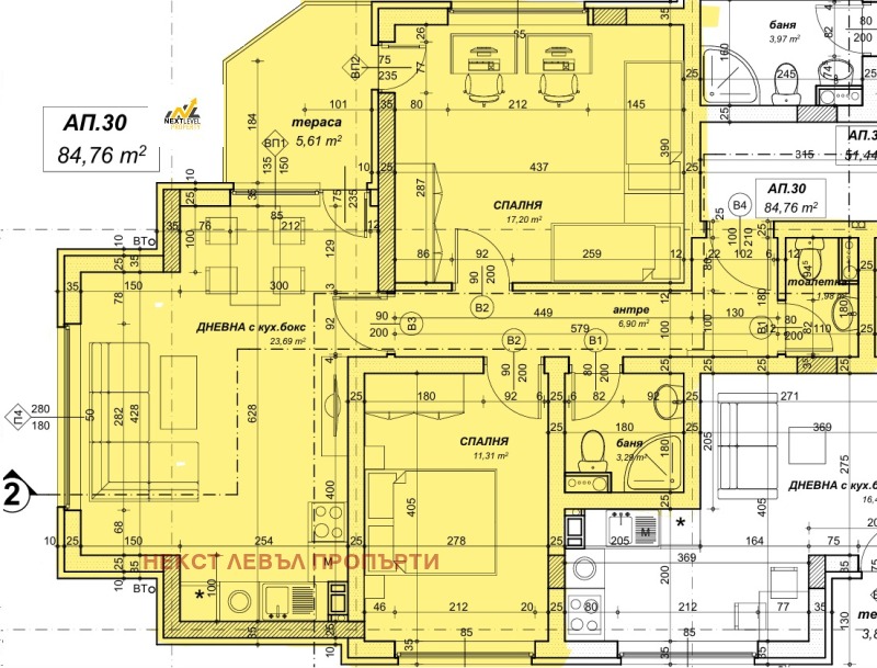 Агенция Некст Левъл Пропърти предлага на Вашето внимание тристаен апартамент от доказан строител със следното разпределение: коридор, кухненски бокс с трапезария, две спални, баня с тоалетна, тоалетна и тераса.