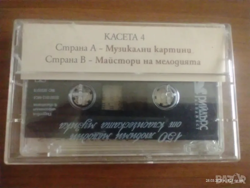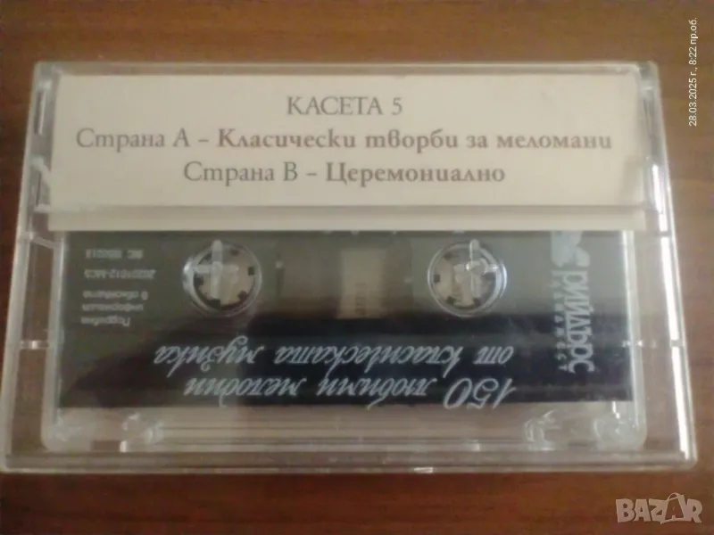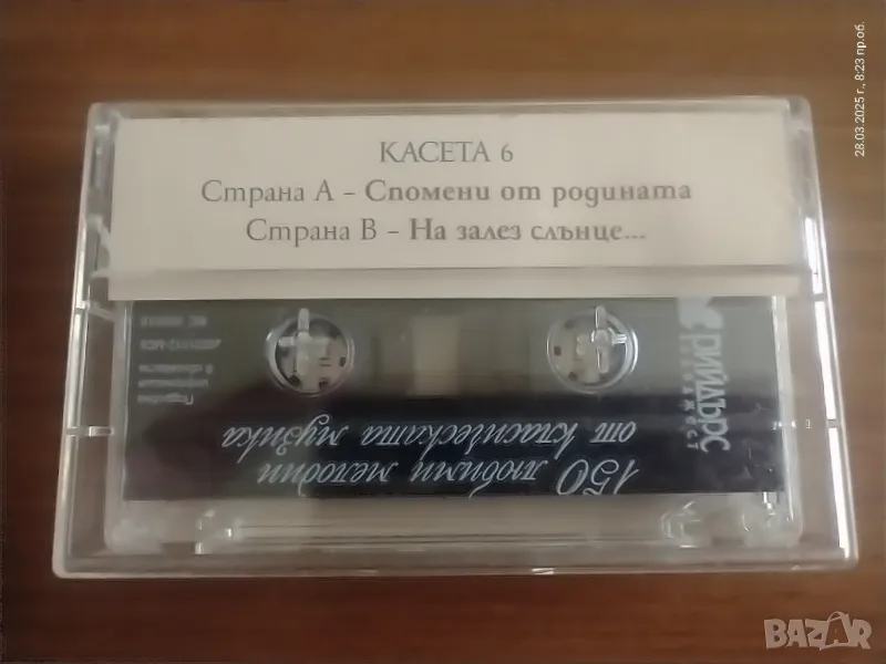 Шест студийни аудиокасети с класическа музика “150 любими мелодии на класическата музика”в отлично състояние.Здрави кутии с описи.Разпространявани са от издателство РИЙДЪРС ДАЙДЖЕСТ.За съжаление касета номер 3 е изгубена.Затова я замествам с една немска касета от същия жанр.Цената е за 6-те касети.