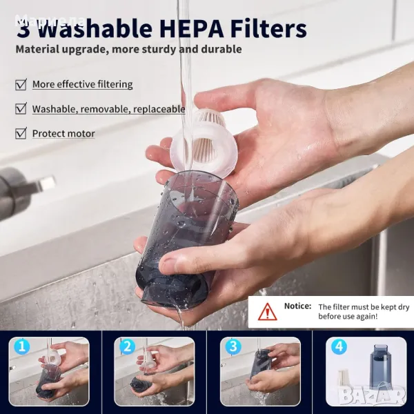 Нашата прахосмукачка за кола е оборудвана с 3 филтъра. Течащият въздух през камерата за събиране на прах може ефективно да разделя праха и въздуха и да намалява вторичното замърсяване. Той използва филтър с висока плътност, който може да се сваля, пере и може да се използва многократно. Изплакнете го и го подсушете, преди да го поставите . Редовното почистване на филтрите предотвратява запушването на смукателната система и поддържа по-добра производителност.