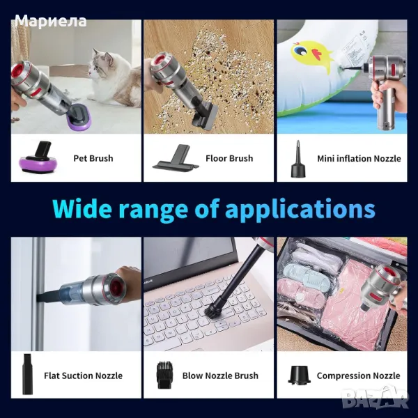 Тези преносими малки прахосмукачки са оборудвани с 11 професионални аксесоара, които могат да отговорят на всички ваши нужди от почистване. Може да се използва в различни условия като автомобили, спалня, кухня, работа и т.н. за почистване на кухини в кола, възглавници на седалки, килими, матраци, легла, маси с клавиатури, компютърно бюро, стълби, плувен пръстен, компресионна торба. За разлика от тези на пазара, ние идваме и със специална четка за домашни любимци, която може да абсорбира животински и кучешки косми по-лесно.