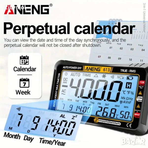 Автоматичен цифров мултицет ANENG 613, 4.5" дисплейAC/DC, ток, честота, съпротивление. С термохигром