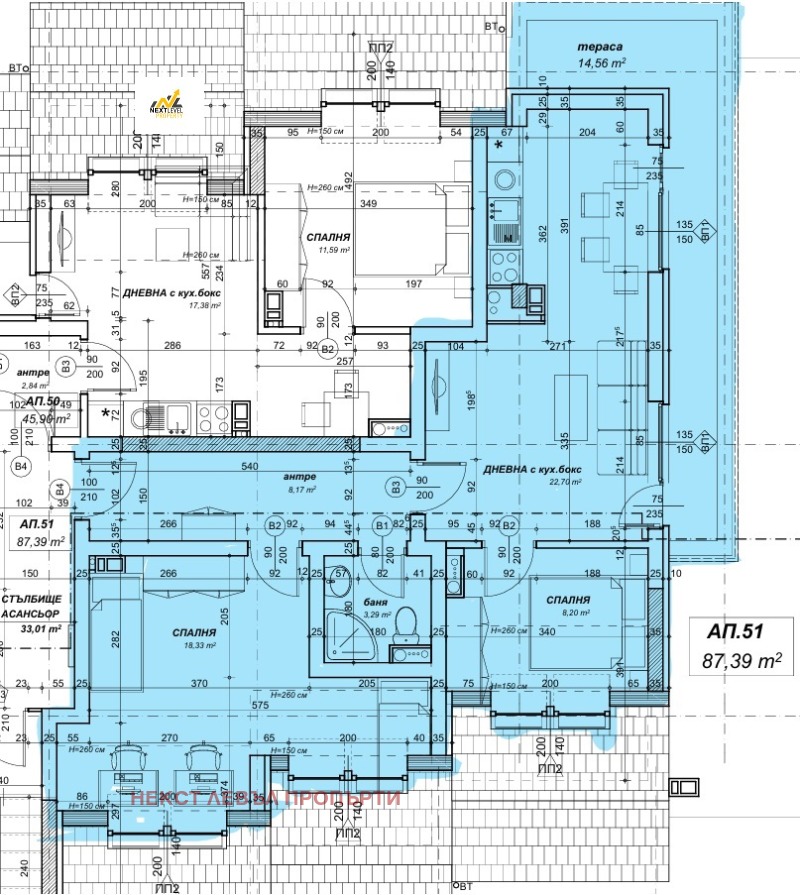 Агенция Некст Левъл Пропърти предлага на Вашето внимание тристаен апартамент от доказан строител със следното разпределение: коридор, кухненски бокс с хол и трапезария, две спални, баня с тоалетна и тераса.
