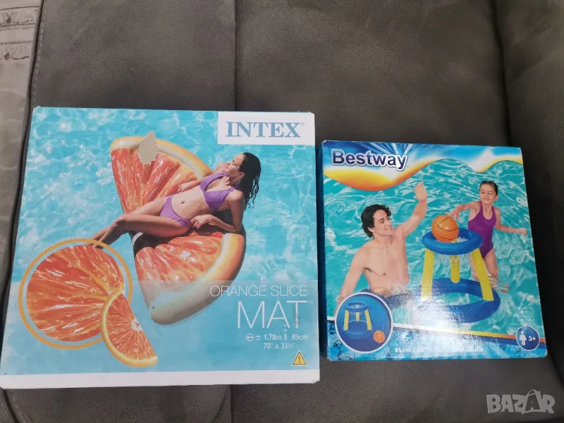Продавам два закупени преди време, но така и неизползвани артикула. Заводско опаковани. Цената е за двата общо. Предпочитам да не ги разделям, т.к. цената е низка и обезсмисля пътя до куриер.1. Надуваем дюшек под реалистична 3D форма на протоколов резен с размери 1.78х85 см на бренд Intex2. Баскетболно игрище/кош за хвърляне на топка 61см, проектиран за употреба във вода на бренд Bestway.