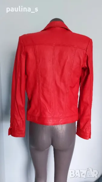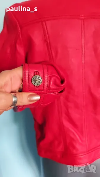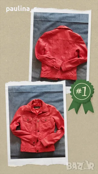1️⃣. Колаж / 2XS / S - "Crazy outfits" Germany. Цената е крайна 59,99лв / 30 евро. Дамско яке от естествена кожа в ярко червен цвят, малък размер. Моделът е Деним, като на дънковите якета. Кожата е много мека и качествена, има лека еластичност. Якето е ново, не е носено, има гънки и следи от съхранението.