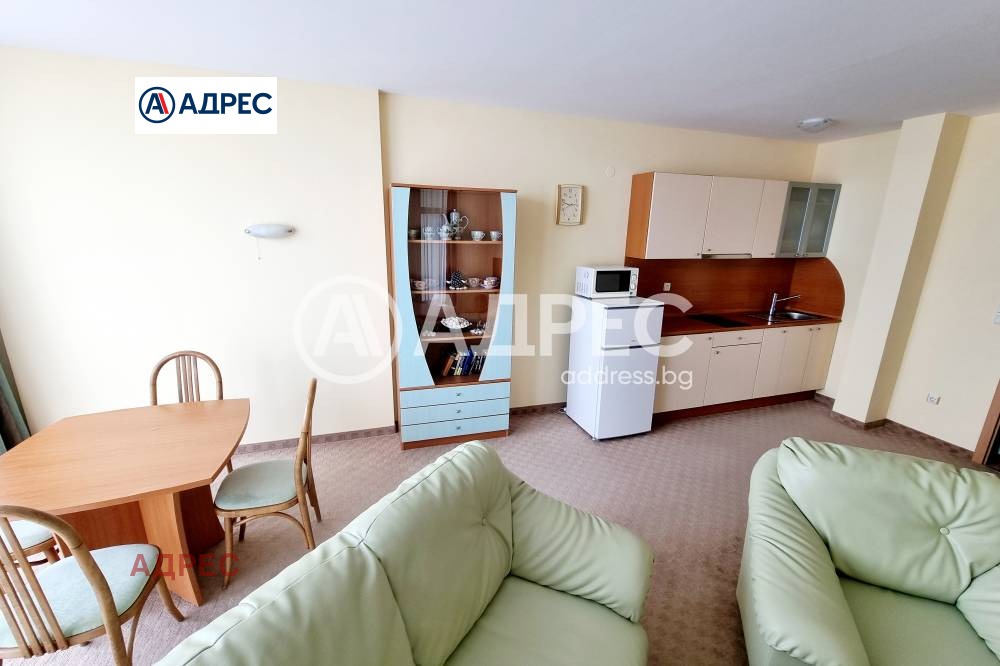 Само от Адрес! Предлагаме двустаен апартамент на първа линия и с фронтална гледка към морето в к.к. 'Златни пясъци'. Жилището се състои от голям хол с кухня/трапезария, непреходна спалня, просторна тераса пред двете с ратанова мебел, коридор, тоалетна, баня/тоалетна.