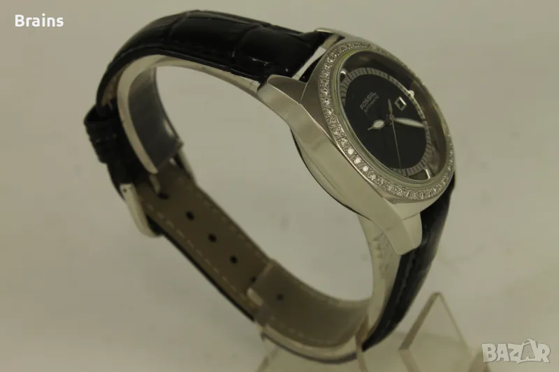 Стилен дамски часовник FOSSIL Arkitekt ES-1368 Automatic. Механизъм - Японски автомат със 21 камъка. Стоманена каса богато укресена със цирконии. Циферблата е тип скелет отстрани и се вижда ротора, който също е богато украсен със цирконии. Отлично състояние. Работи точно.