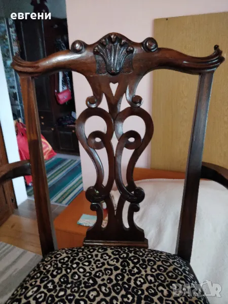 Два стола с дърворезба подходящи за пред камина с размери от пода до седалката 50см.разстояние между дръжките 50см.и височина на облегалката от пода 1м5см.Купени в Англия.Двата 600лв.